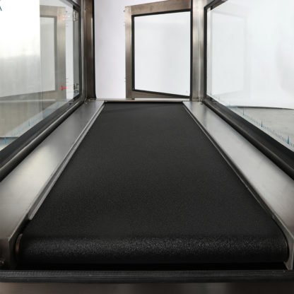 - The treadmill has a wide collar on both sides on which the handler can stand to help, support or stimulate the dog’s movements.