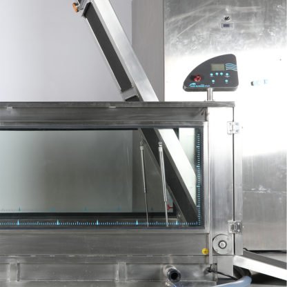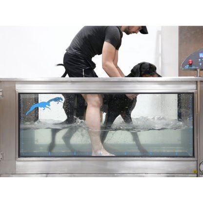Thanks to the easily accessible (ramp included) underwater treadmill, equipped with a separate entrance and exit, every dog can easily get in and out of the treadmill. The amount of water, the temperature of the water, the speed of the treadmill (0.5-16 km/h) can all be easily regulated. The treadmill fills (and empties) in 120 seconds. This is amazingly fast. Thanks to the external tank of no less than 900 liters, the water (which is purified and disinfected) can often be reused.